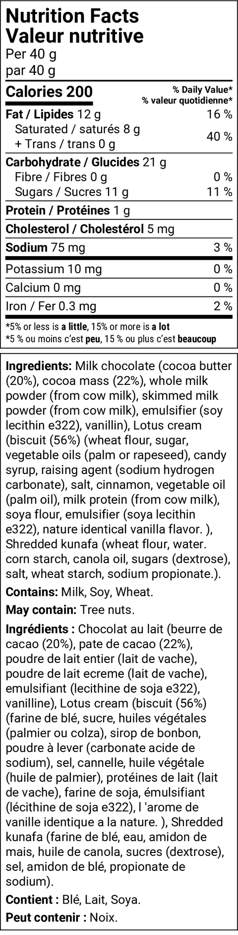 Introducing our Dubai Lotus Biscoff Knafeh Chocolate Bar – a delicious blend of rich, velvety chocolate and the exotic flavours of traditional Middle Eastern knafeh. Each bar features a smooth chocolate shell and a crunchy Lotus Biscoff knafeh centre. Available in Milk or Dark chocolate.