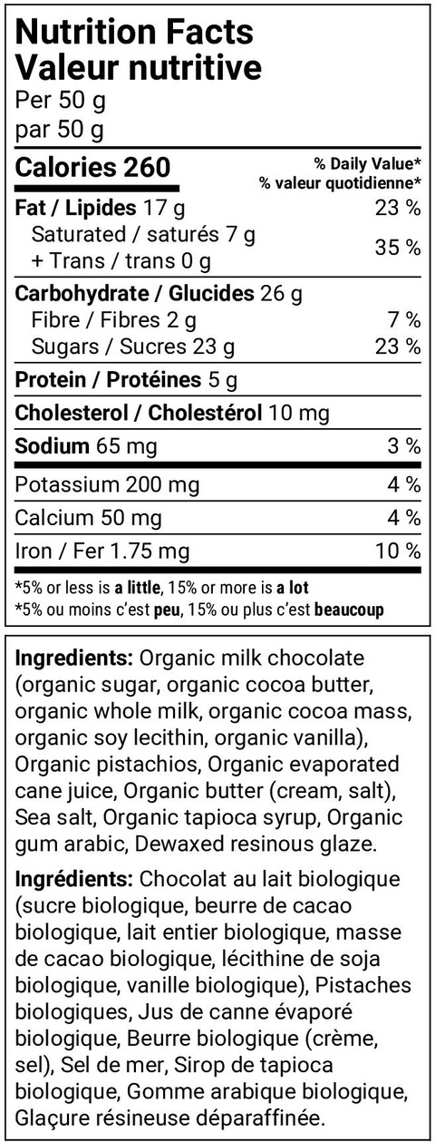 Organic Chocolate Toffee Pistachios are shelled, individual nuts dipped in luscious layers of sweet toffee and milk chocolate. Earthy and creamy pistachios are paired with rich chocolate and caramel-like toffee flavours to create a crunchy, nutty bite.