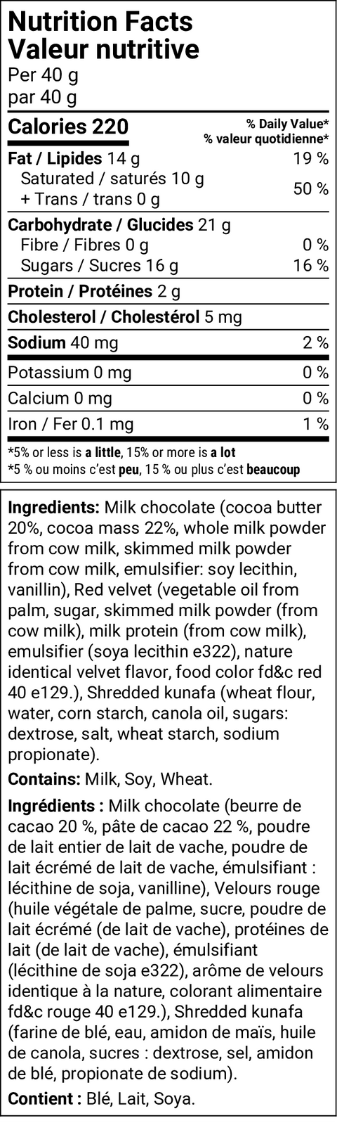 A delicious blend of rich, velvety chocolate and the exotic flavours of traditional Middle Eastern knafeh. Our Red Velvet Dubai chocolate bar features a milk chocolate shell and a red velvet knafeh mix flavouring in the center that blends perfectly.