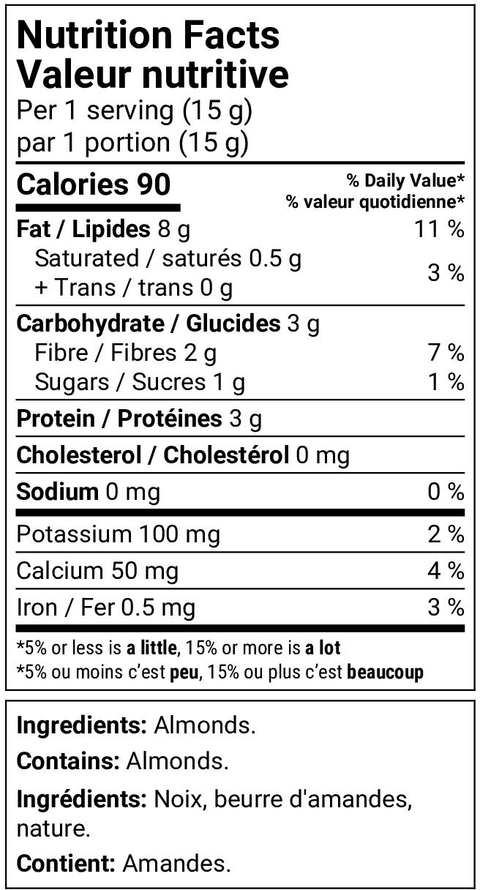 Palm Bites Natural Almond Butter is a smooth blend of whole almonds without the addition of oil, fat, salt, or sugar. Thick and creamy in texture, almond butter is also nutty and buttery in flavour.