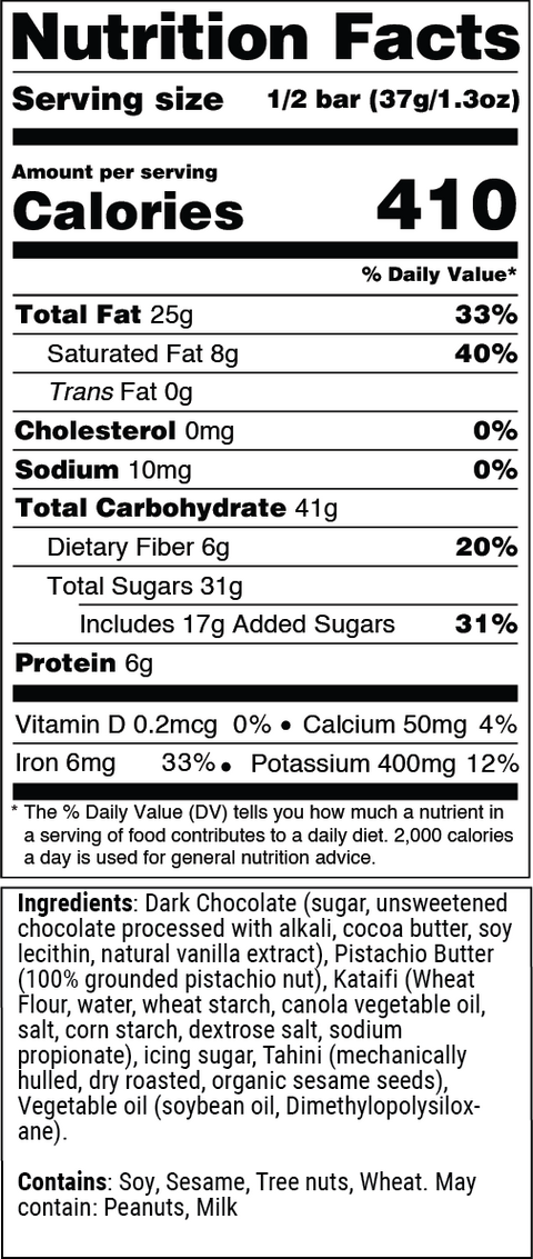 Introducing our Vegan Pistachio Dubai Chocolate Bar – a delicious blend of rich, velvety chocolate and the exotic flavours of traditional Middle Eastern knafeh. Each bar features vegan dark chocolate shell and a crunchy mix of Pistachio nut butter (100% Pistachio), tahini, and knafeh in the centre.